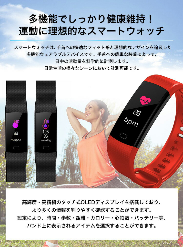 ■宅急便【別途送料+お買い物ガイド参照】【詳細】 ■新品 ■素材:TPE 熱可塑性エラストマー ■重量:23g程度 ■バンドの長さ:250mm程度 ■バッテリータイプ:リチウム ■バッテリー容量:60mAh ■充電時間:1.5時間 ■使用時間:約5-7日 ■規格:ブルートゥース4.0 ■防水規格:iP67 ■環境:-10度〜50度 ■対応OS:アンドロイド4.4/iOs8.0以上 スマートウオッチ 防水 血圧 心拍計、血圧測定、活動量計、歩数計、座りがちの自動注意、睡眠モニター、SMS通知、電話の着信通知、アラーム、データ同期、データ分析 時計 心拍数 走行距離 カロリー消費 睡眠モニター 水泳 父の日 母の日 恋人 友人 誕生日 プレゼント ギフト iphone android フィットネス ヨガ リストバンド 健康サポート機器 ウェアラブル ウォッチ